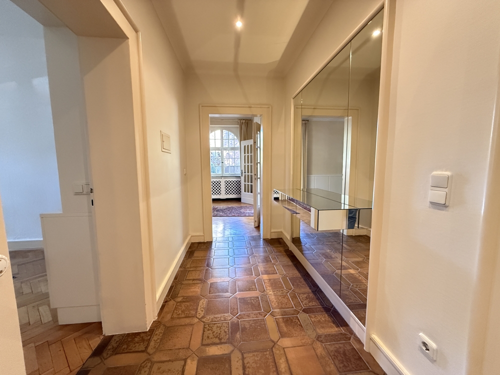 Eine der beeindruckendsten Mietgelegenheiten in Buer: Es besteht aktuell die Möglichkeit die 3 Wohnungen dieser denkmalgeschützten Stadtvilla von 1915 als Ganzes zu nutzen und die großzügige Raumaufteilung im historischen Stil mit zeitgemäßer Ausstattung zu genießen. Damit bietet sich einer Familie die Chance, das gesamte Haus für sich zu bewohnen. Das Erdgeschoss mit ca. 120 m² Wohnfläche empfängt Sie mit einem weitläufigen Dielenbereich und hohen Decken. Das Wohn- und Esszimmer erstreckt sich über eine besonders großzügige Fläche und ist durch zahlreiche große Fenster lichtdurchflutet, was eine freundliche und einladende Atmosphäre schafft. Im Wohnbereich sorgt ein Kamin für zusätzliche Gemütlichkeit. Die beiden Bereiche sind dezent durch eine beeindruckende Holztür getrennt, die bei Bedarf geöffnet werden kann und so einen harmonischen, fließenden Übergang ermöglicht. Das Badezimmer wird gerade saniert. Der Dielenbereich und die Küche sind mit einem Fliesenboden ausgestattet, der den historischen Charakter des Hauses auf besondere Weise unterstreicht. Im Wohn- und Esszimmer sowie im Arbeitszimmer liegt Echtholzparkett. Ein besonderes Highlight ist der weitläufige Garten mit einem kleinen Teehäuschen an der historischen Grenzmauer – ideal als Rückzugsort oder charmantes Raucherhaus. Die Wohnung im ersten Obergeschoss mit ebenfalls 120 m² Wohnfläche überzeugt durch helle, großzügige Räume und eine klassische Raumaufteilung. Drei Zimmer, Küche und Bad bieten vielseitige Nutzungsmöglichkeiten. Ein sonniger Balkon lädt zum Entspannen ein und vermittelt Ruhe und Privatsphäre. Im Dachgeschoss wurden zwei Appartements zu einer Einheit von 70 m² zusammengelegt. Sichtbare Holzbalken prägen den Wohnbereich und schaffen eine gemütliche Atmosphäre. Die kleine Küche kann auf Wunsch geöffnet und in eine offene Wohnküche integriert werden. Ein modern saniertes Duschbad mit Hauswirtschaftsraum sowi