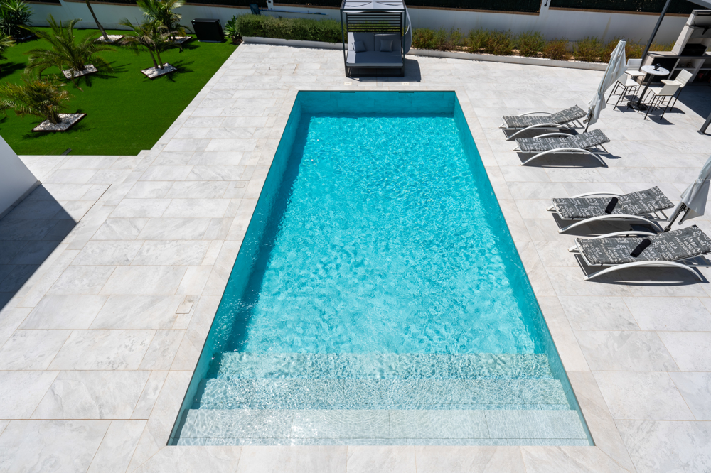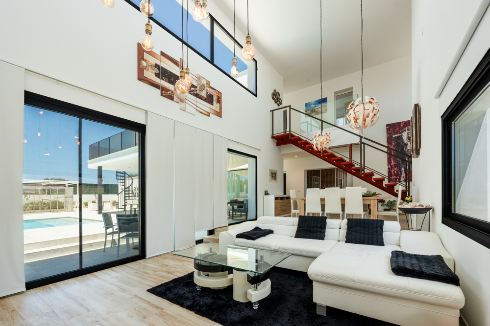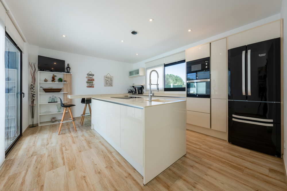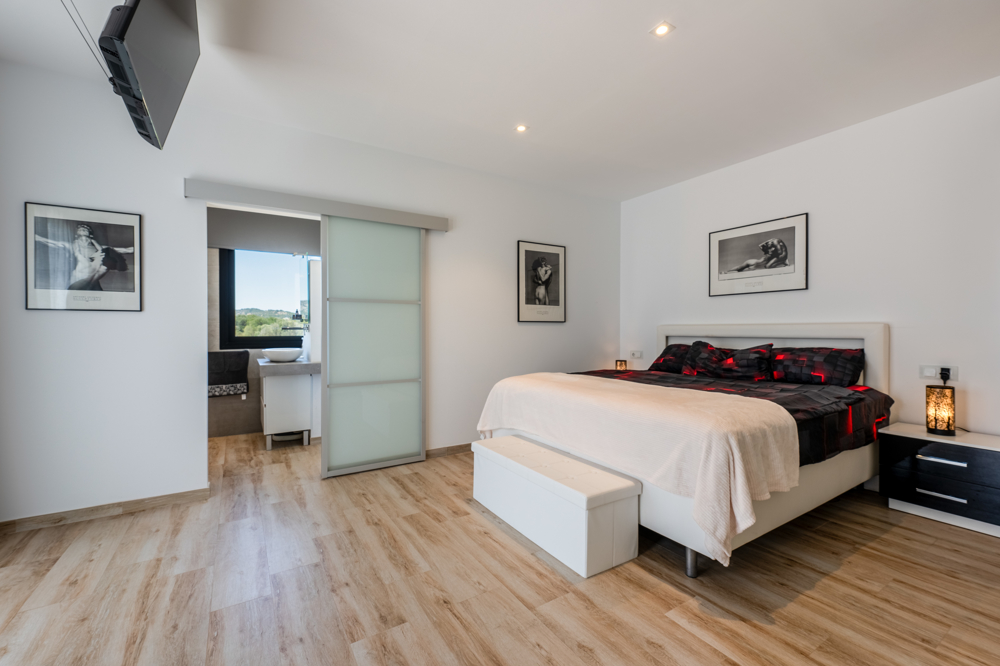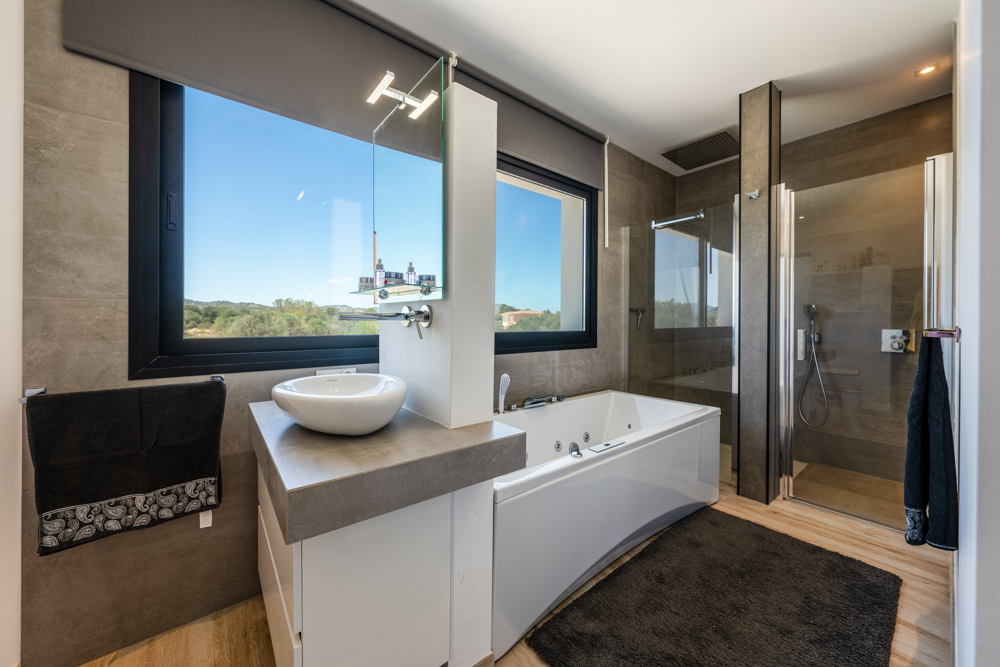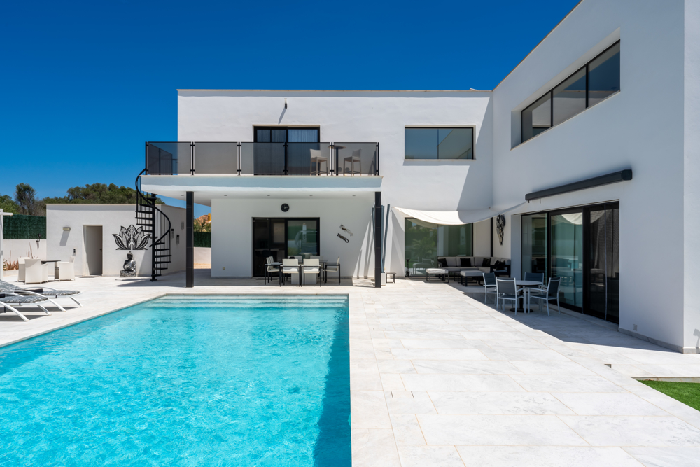 Im idyllischen Südosten Mallorcas erwartet Sie diese beeindruckende Design-Villa, die 2023 fertiggestellt wurde und höchsten Wohnkomfort mit modernster Architektur verbindet. Auf einem großzügigen Grundstück von ca. 1.229 m² genießen Sie ein unvergleichliches Wohngefühl – mit stilvollem Ambiente, luxuriöser Ausstattung und einem traumhaften Außenbereich. Die Villa verfügt über vier großzügige Schlafzimmer und vier moderne Bäder. Herzstück des Anwesens ist der ca. 50 m² große Pool, der sowohl beheizt als auch gekühlt werden kann und somit zu jeder Jahreszeit perfektes Badevergnügen bietet. Circa 400 m² Terrassenfläche laden zum Entspannen und Genießen ein – ob in der gemütlichen Gartenlounge, am Outdoor-Essplatz oder an der voll ausgestatteten BBQ-Außenküche. Im Obergeschoss befinden sich zwei großzügige Schlafzimmer mit jeweils eigenem Duschbad und direktem Zugang zu einem ca. 25 m² großen Balkon. Das luxuriöse Master-Schlafzimmer begeistert mit einem en-suite-Badezimmer, das über eine begehbare Regendusche und eine Whirl-Wanne verfügt. Das offene Wohnkonzept erstreckt sich über zwei Etagen und wird durch große Schiebefenster mit Tageslicht durchflutet. Der Wohnbereich bietet eine elegante Sitzecke mit Sat-TV sowie einen großzügigen Essbereich mit hochwertigen Designermöbeln. Ein weiteres Schlafzimmer mit eigenem Duschbad befindet sich im Untergeschoss und sorgt für zusätzliche Privatsphäre. Die hochmoderne Markenküche, ausgestattet mit erstklassigen Elektrogeräten, macht das Kochen zu einem echten Vergnügen. Technisch ist die Villa auf dem neuesten Stand: Dank Highspeed-WLAN sind Sie im gesamten Haus und Außenbereich optimal vernetzt. Eine nachhaltige Wärmepumpe sowie eine moderne PV-Anlage mit Speicher sorgen für maximale Energieeffizienz. Zusätzlich garantiert eine Fußbodenheizung in allen Räumen ein angenehmes Klima. Ein besonderes Highlight ist das luxuriöse Saunahaus mit eigenem Duschbad, das sich auf der Terrasse im Palmengarten befindet.