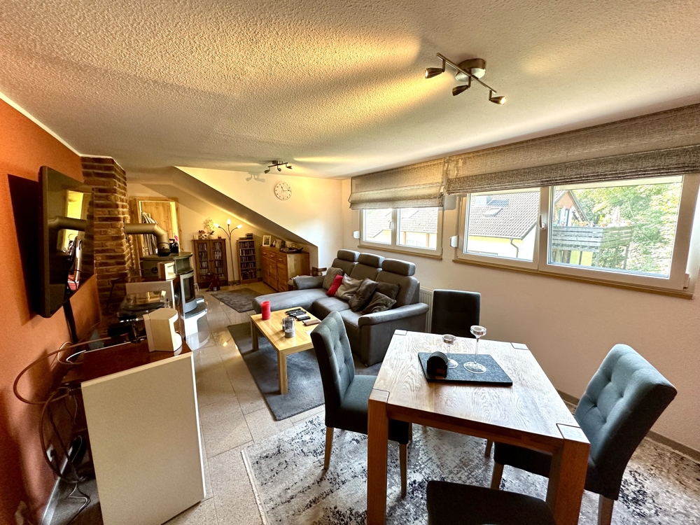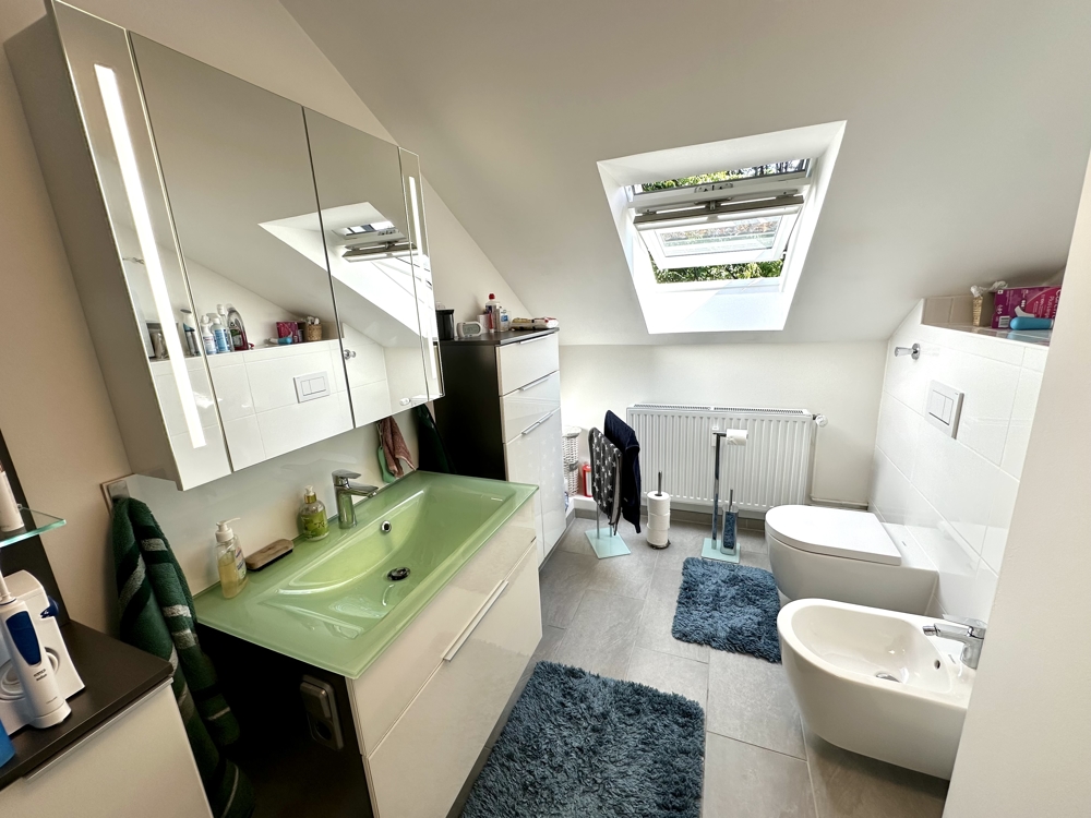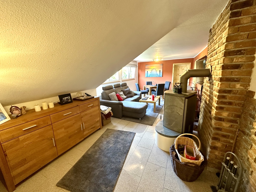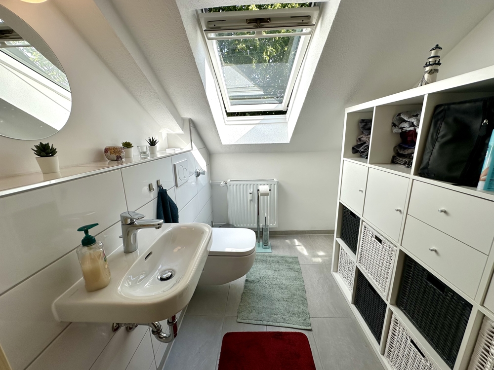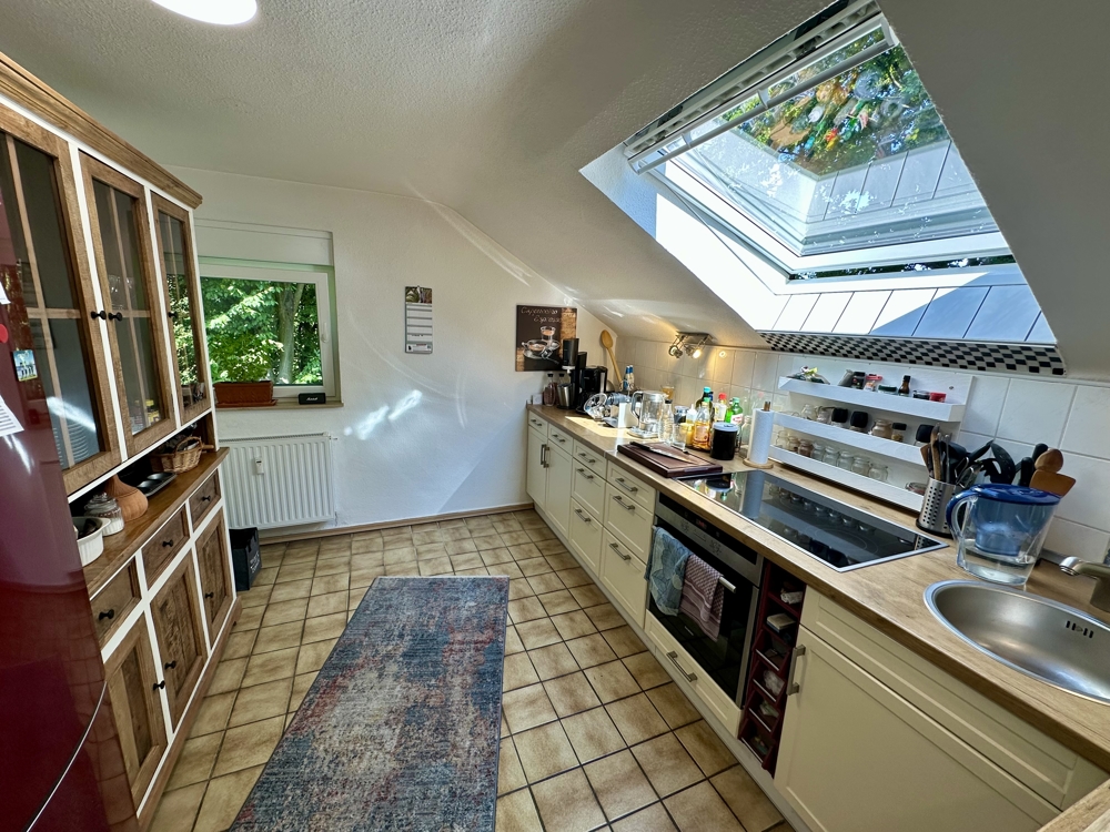In ruhiger und dennoch zentraler Lage von Ratingen-Hösel, befindet sich diese modernisierte Eigentumswohnung im Dachgeschoss eine gepflegten Mehrfamilienhauses. Neben der Diele und dem geräumigen und modern gestalteten Gäste-WC, verfügt die Wohnung über eine großzügigen Küchenbereich. Die hier vorhandene Einbauküche ist im Preis inbegriffen. Direkt angrenzend finden Sie den großen Wohn-und Essbereich. Highlight hier ist zweifelsohne der eigene Kaminofen, der gemütliche Stunden im Winter garantiert. Von hier aus erreichen Sie linkerhand das Arbeits- bzw. Kinderzimmer der Wohnung. Hier bestünde grundsätzlich auch die Möglichkeit, nachträglich einen Balkon anzubauen. Eine erste Voranfrage hierzu ist positiv ausgefallen. Auf der anderen Seite des Wohnbereiches, gelangen Sie dann in das Schlafzimmer mit integrierten kleinem Ankleidebereich. Von hier aus erreichen Sie zudem auch, das ebenfalls modern gestaltete Hauptbad der Wohnung. Dieses bietet Ihnen eine große bodentiefe Dusche, ein Bidet und verfügt natürlich, wie das Gäste-WC auch, über ein großes Fenster. Ein eigener Kellerraum, ein Waschküchenbereich und eine gemeinschaftlich nutzbare Terrasse im Außenbereich gehören genauso zur Wohnung, wie ein eigener Außenstellplatz direkt am Haus.