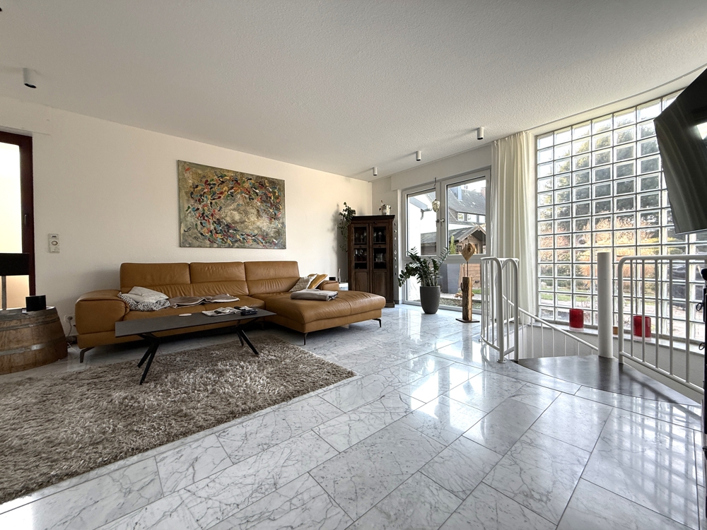 Diese attraktive Erdgeschosswohnung mit einer Wohnfläche von ca. 135 m² befindet sich im Erd- und Kellergeschoss eines gepflegten Dreifamilienhauses in zentraler Lage von Gladbeck-Mitte. Die Wohnung überzeugt durch ihre großzügige Raumaufteilung, eine besondere Split-Level-Architektur sowie eine hochwertige Ausstattung und bietet ein außergewöhnliches Wohnambiente mit direktem Gartenbezug. Über die einladende Diele gelangen Sie in die Küche, das Schlafzimmer sowie in das moderne, barrierefreie Badezimmer, das mit einer großzügigen bodengleichen Dusche ausgestattet ist. Herzstück der Wohnung ist der offen gestaltete Wohn- und Essbereich, der durch seine Split-Level-Anordnung architektonisch reizvoll gestaltet ist. Ein Kamin sorgt für eine angenehme Wohnatmosphäre, während der elegante weiße Marmorboden und die gasbetriebene Fußbodenheizung den hohen Ausstattungsstandard unterstreichen. Große Fensterflächen lassen viel Tageslicht in die Räume und öffnen den Wohnbereich direkt zum Garten, wodurch Innen- und Außenraum harmonisch miteinander verbunden werden. Im Kellergeschoss der Wohnung stehen ein weiteres Schlafzimmer, ein zusätzliches Badezimmer, ein Hauswirtschaftsraum sowie eine Sauna zur privaten Nutzung zur Verfügung. Ergänzend bietet ein renovierter Kellerraum ausreichend Stauraum für persönliche Gegenstände. Der angelegte Garten mit Teich und Geräteschuppen lädt zum Entspannen und Verweilen ein und bietet einen hohen Erholungswert inmitten der Stadt. Die Gartenfläche ist direkt vom Wohnbereich aus zugänglich und erweitert den Wohnraum ideal in den Außenbereich. Eine zur Wohnung gehörende Garage sowie ein zusätzliches Carport bieten komfortable Parkmöglichkeiten. Die zentrale Lage in Gladbeck-Mitte ermöglicht eine gute Anbindung an öffentliche Verkehrsmittel sowie kurze Wege zu Einkaufsmöglichkeiten, Ärzten, Schulen und weiteren Einrichtungen des täglichen Bedarfs. Wir freuen uns auf Ihr Anfrage!